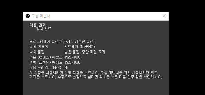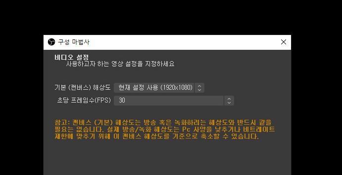 ▼세가지 선택지 중에 사용을 원하시는 선택지를 골라주시면 되는데 어떤걸 선택해야 하는지 모르겠으면 녹화 최적화, 방송은 하지 않음을 선택해주시면 됩니다. 방송을 하더라도 PC사양에 따라 설정값을 바꿔줘야 하기 때문에 녹화 최적화 하시는걸 추천합니다.