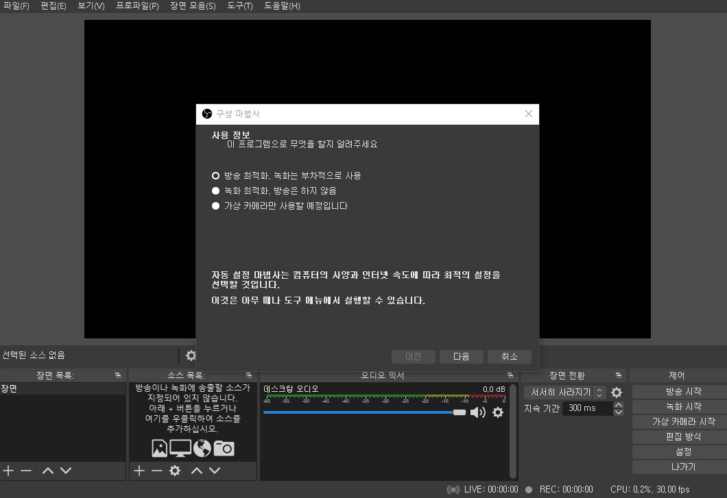 OBS스튜디오를 다운받고 나서 실행시키면 어떤 용도로 사용 할건지에 따라 바로 간단 설정을 할 수 있는 창이 뜹니다.