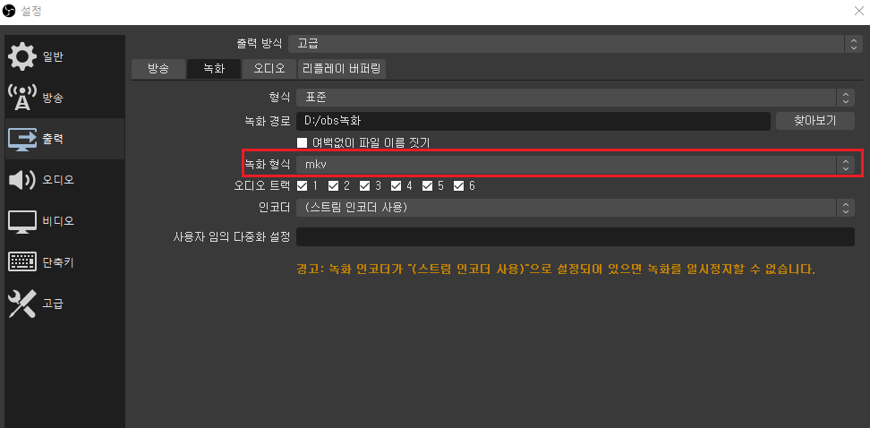 OBS를 이용해 바로 녹화를 진행하시면 엄청 큰 용량을 차지할 수 있습니다. 따라서 저는 녹화형식을 바꿔서 저용량으로 녹화를 하는데요. 녹화형식은 MKV파일로 지정해줍니다.