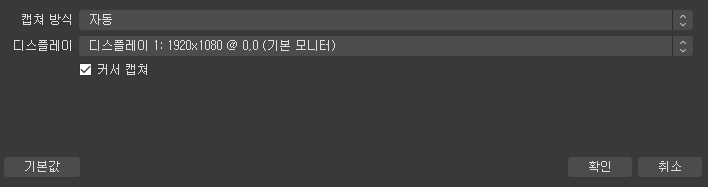 그러면 캡쳐 방식과 디스플레이가 뜨는데 캡쳐 방식은 자동, 디스플레이는 기본 모니터로 설정해주시면 됩니다.
