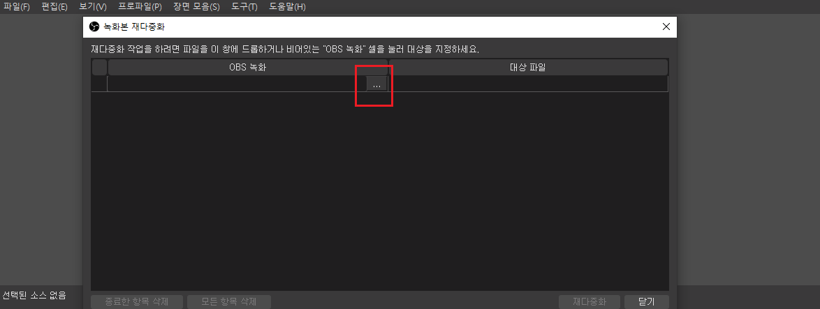 파일 -> 재다중화 녹화 클릭해줍니다. 그럼 아래 창이 뜨는데 저기 ... 을 눌러 녹화한 MKV파일을 불러 옵니다.