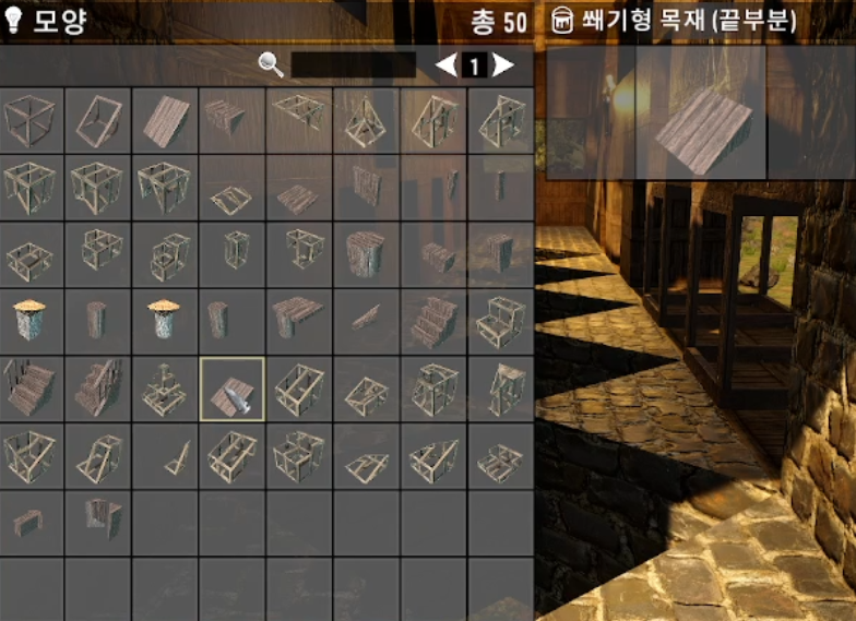 ▲목재프레임을 R버튼을 꾹 누르면 모양을 바꿀 수 있습니다. 가장 상단 왼쪽 두번째 타일을 사용하며 총 타일 4칸에 하나의 [◇] 모양으로 바닥을 설계해줍니다.