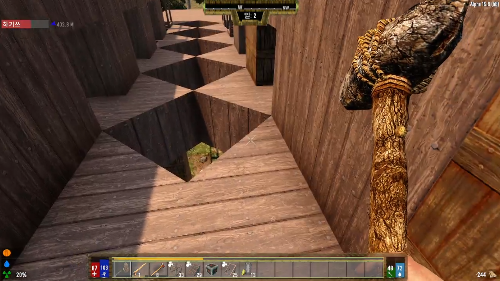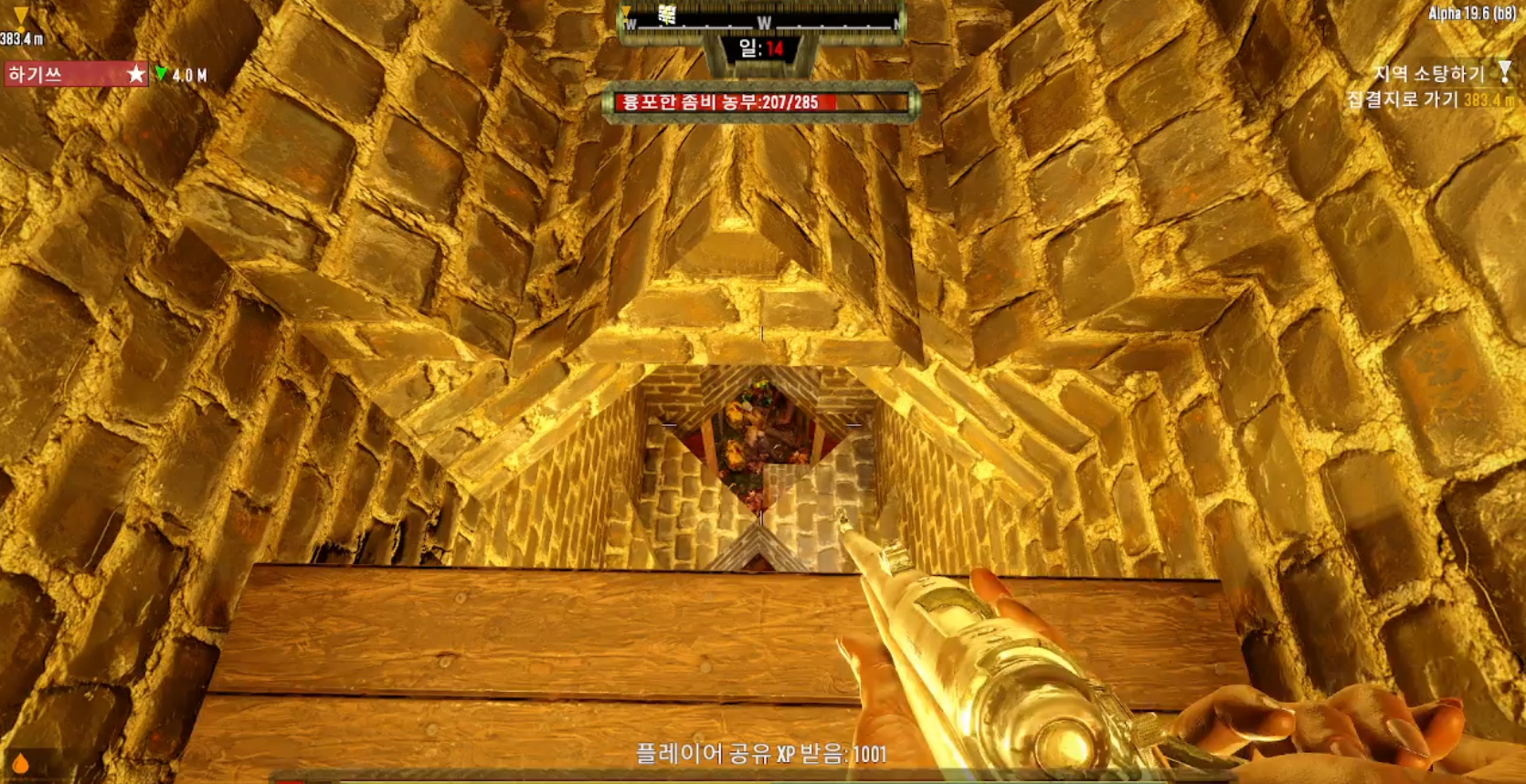 ▲올라온 존비를 사냥해도 되지만, 충분히 높게 지으셨다면 좀비들이 낙데미지를 받고 넘어졌을때 한발한발 맞춰서 사냥해주시는게 가장 효율적입니다.