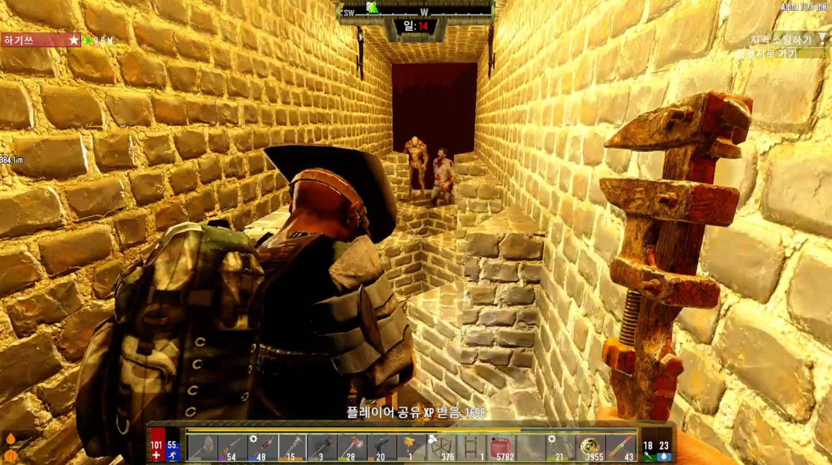 ▲올라온 존비를 사냥해도 되지만, 충분히 높게 지으셨다면 좀비들이 낙데미지를 받고 넘어졌을때 한발한발 맞춰서 사냥해주시는게 가장 효율적입니다.