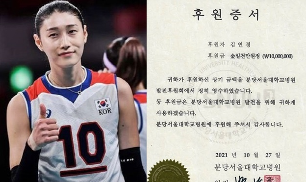 1000만원 기부를 약속한 김연경이 분당 서울대학교병원 소아병동에 기부를 했는데요.