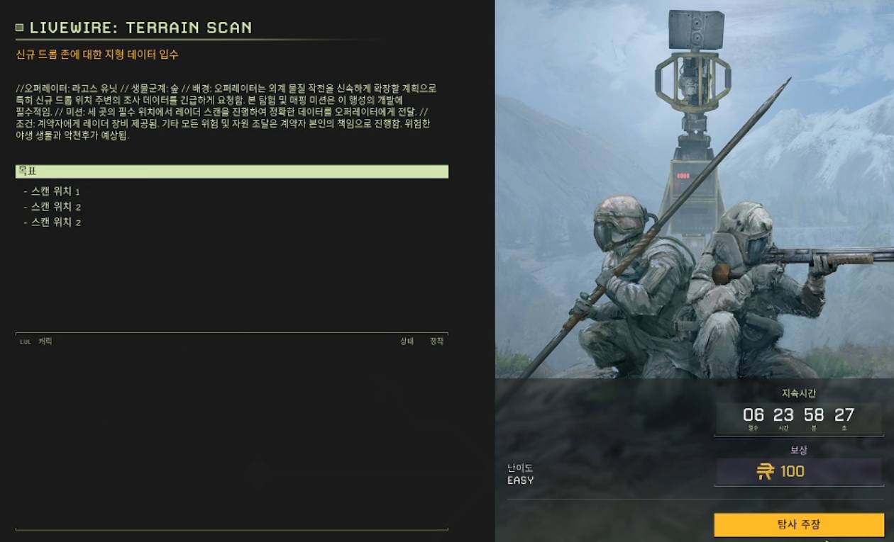 LIVEWIRE : TERRAIN SCAN는 처음 튜토리얼을 끝내고 처음 하는 미션입니다.