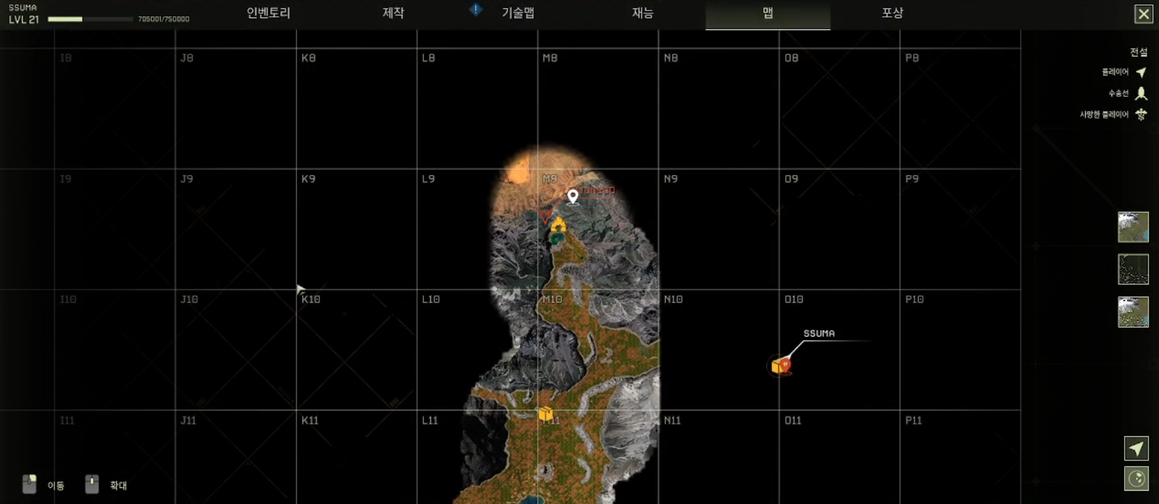 ▲맵 정보 입니다. 보급위치는 순서는 상관없으며, 왼쪽아래, 오른쪽 아래 표시가 있는 곳입니다. 동굴위치는 M9구역에 위치하고 있습니다. 피난처 위치는 동굴앞에 호수가 있는데 거기에 설치 하는게 위치상으로 유리하기 때문에 추천합니다.