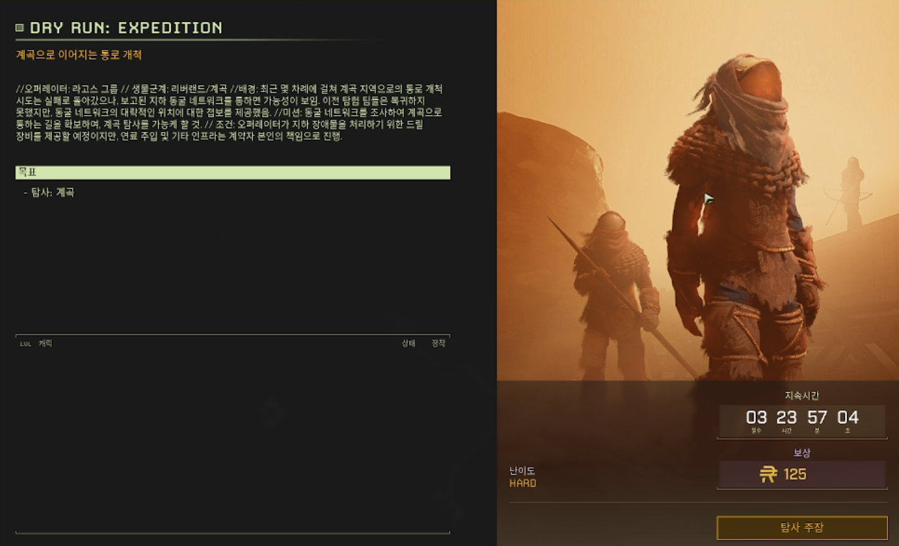 DRY RUN : EXPEDITION미션은 125원의 보상과 [계곡으로 이어지는 통로 개척]의 부제가 있는 퀘스트입니다.