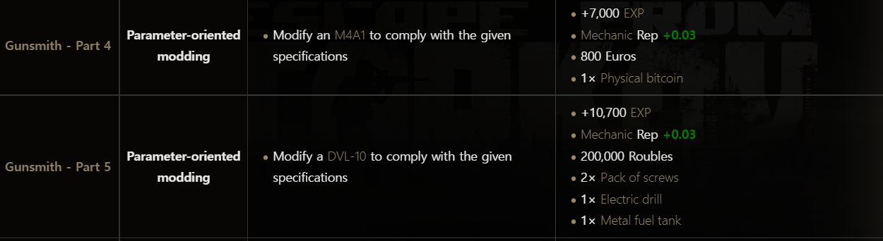 | 건스미스 Part 4~5 | 필요 총기 (M4A1, DVL-10) | 보상 |