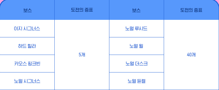 도전의 증표는 주간 보스를 잡고 얻을 수 있습니다.