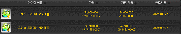 메이플 옥션에서 보시면 고농축 프리미엄 생명의 물 또한 메소로 구매가 가능합니다.