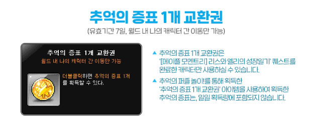 추억의 퍼즐놀이는 월드당 1회만 수행 가능하며, 이벤트 진행상황은 월드 내 모든 캐릭터 끼리 공유합니다.