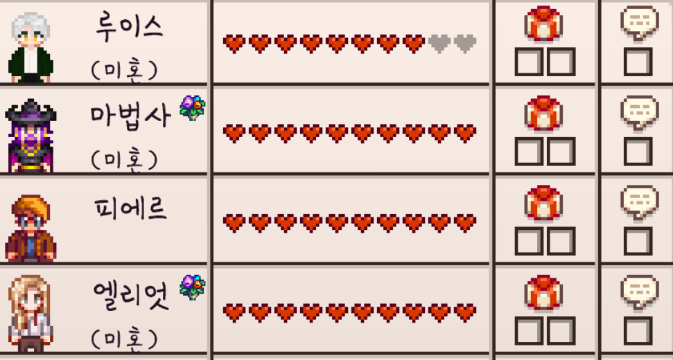 호감도를 올리는 방법은 선물을 주는건데요. 주민마다 선호하는 선물들이 따로 있긴하나 어지간해서는 다 좋아합니다.