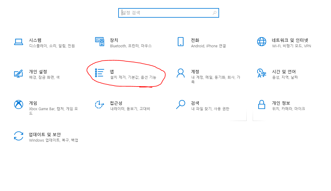 ▲윈도우 -> 설정 창입니다. 여기서 앱 버튼을 눌러줍니다.