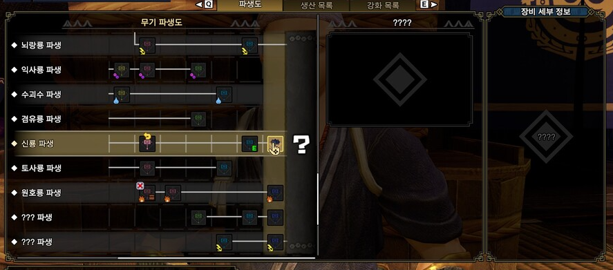 ?로 표시되어있는 무기는 아직 재료를 얻지 못했다고 생각하시면 됩니다.