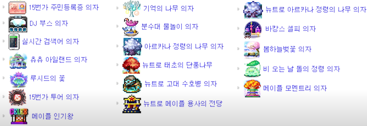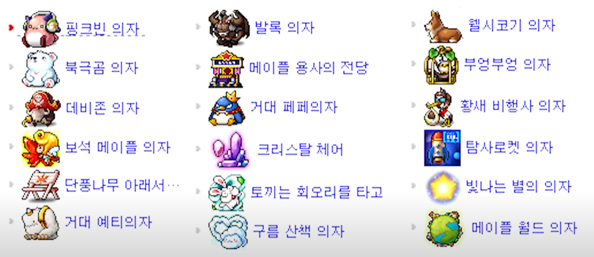 20주년 의자상자에는 총 36종의 의자중에 선택하여 획득 할 수 있습니다.