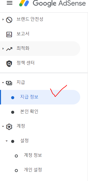 1. 애드센스 로그인 후 좌측에 지급 -> 지급 정보를 들어간다.