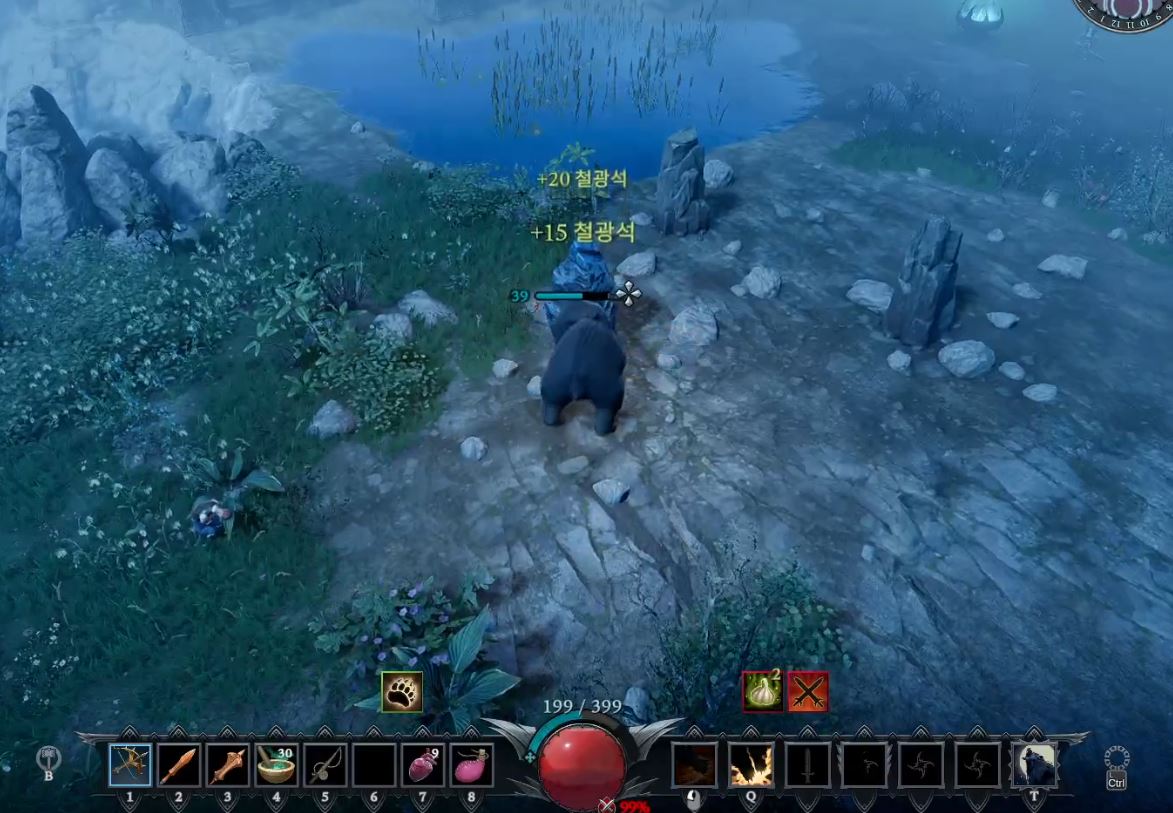 무자비한 무기 아무거나 착용하여 레벨을 39렙을 만든 후 곰으로 변신하여 철을 공격하면 철을 캘수 있습니다.