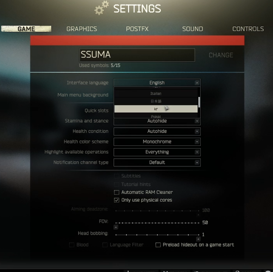 다음으로 GAME -> Interface language -> kr 순서로 눌러주시면 됩니다.