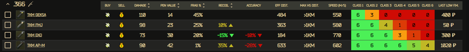 타르코프 탁약차트 최신 2023년 4월 기준( 데미지 관통력 )