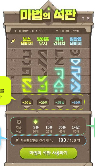 마법의 석판 지속시간은 5분에 간식 10개가 기본이고 이후 간식수가 올라가니 확인하시면 됩니다.